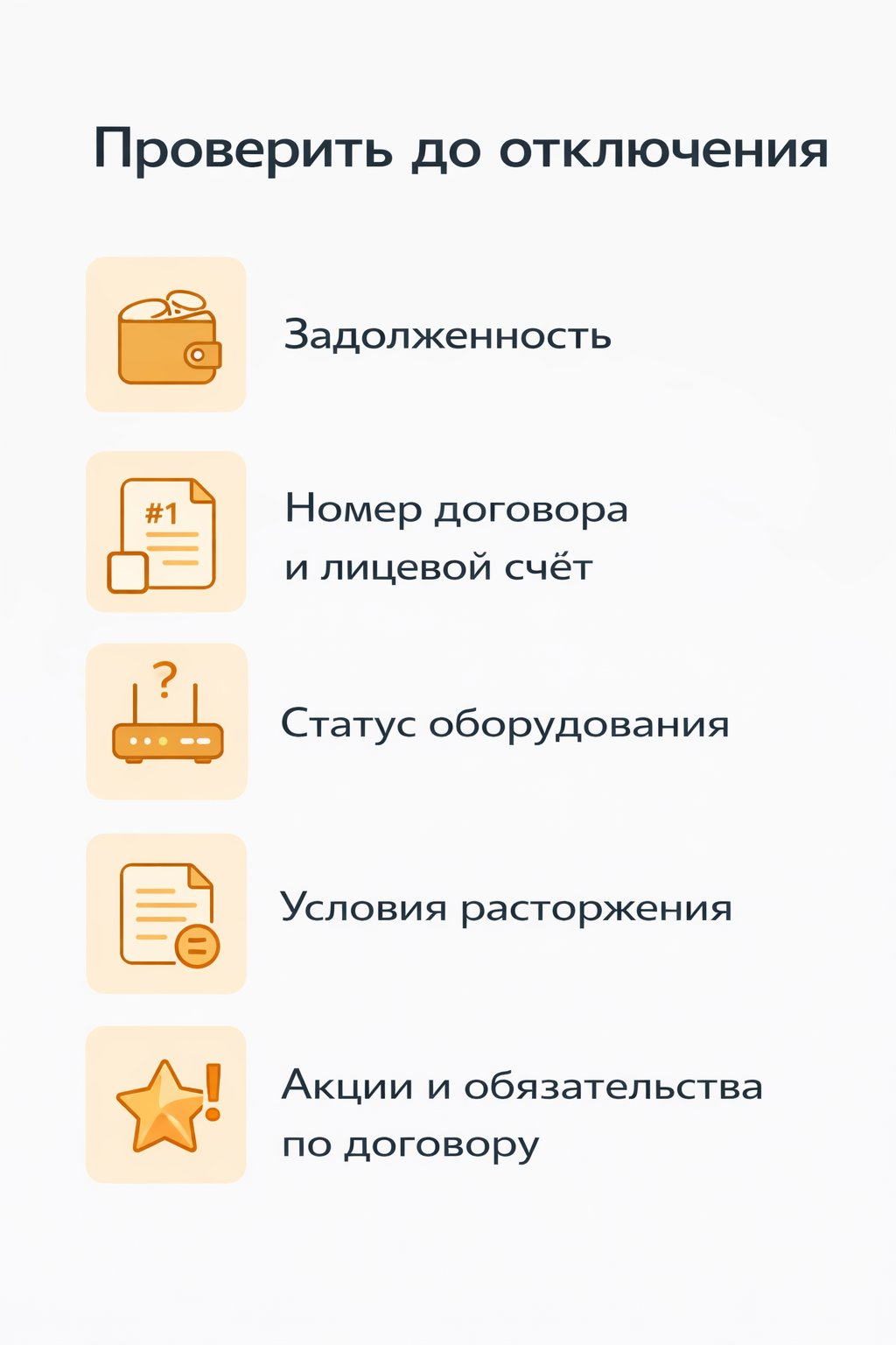 Перед отключением старого оператора нельзя ограничиваться мыслью “потом разберусь”. Именно здесь часто появляются лишние платежи. До расторжения полезно проверить задолженность, номер договора, статус оборудования, условия расторжения и наличие акций или обязательств, которые еще влияют на расчеты.